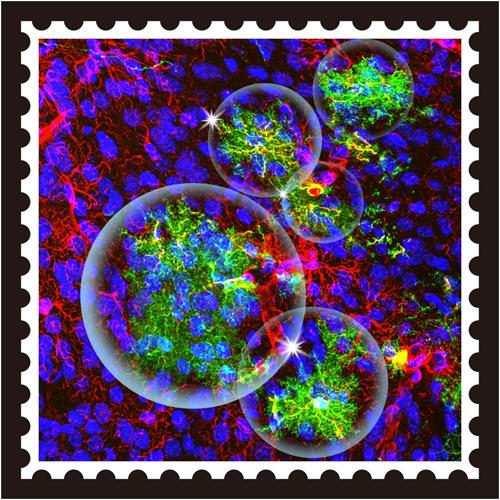 封面圖片:綠色熒光蛋白(綠色)和GFAP(紅色)共標(biāo)的移植星形膠質(zhì)細(xì)胞在移植后12周可分布于成年小鼠皮層并呈現(xiàn)成熟星形膠質(zhì)細(xì)胞的形態(tài)。宿主星形膠質(zhì)細(xì)胞為GFAP(紅色)單標(biāo)的細(xì)胞。DAPI(藍(lán)色)著色結(jié)構(gòu)為細(xì)胞核。