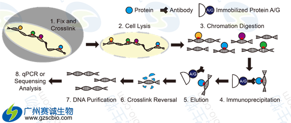 如上圖所示,細(xì)胞裂解液里的蛋白和相關(guān)染色質(zhì)暫時(shí)結(jié)合;DNA-蛋白復(fù)合物被剪切,與所研究蛋白相關(guān)的DNA片斷被選擇性免疫沉淀;相關(guān)DNA片斷被純化,順序被測(cè)定。